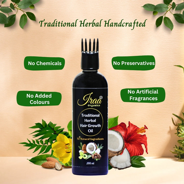 Do you believe in miracles? Yes, you will start to believe when you use Iraa Organics Traditional herbal hair growth oil. It is multipurpose hair oil which solves all your hair issues. This premium quality Iraa Organics Traditional Herbal Hair Growth Oil is loaded with carefully selected 30+ natural herbal ingredients which are freshly collected from the foot hills of the Western Ghats. The ingredients present in the oil are rich in phytochemicals such as vitamins, minerals, proteins, triglycerides, polyphenols, flavonoids, alkaloids, terpenoids, tannins and volatile oils that helps to maintain a healthy scalp pH, hydrates the scalp, fight bacterial & fungal infections of scalp, repairs dry frizzy hair, increases the blood circulation to hair root, stimulates hair follicles and gives you voluminous thick strong black shiny hair. The oil's rich blend of natural ingredients, works in harmony to transform your hair care routine. Whether you're dealing with thinning hair, scalp issues, or simply want to maintain healthy locks, this Iraa Organics traditional hair growth oil offers a complete solution for your hair care needs.